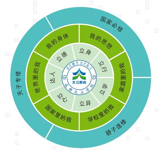 课程以“爱与智慧”为教育的核心理念,围绕“六立一达”培养 目标,设置六大主题(我的身体、我的思想、家庭里的我、学 校中的我、国家里的我、世界里的我)进行教学,设置三类课 型以服务个性化学习需求(国家必修、天立专修、骄子选修), 做到因材施教,将每一位学生培养成为具备“六立一达”核心素